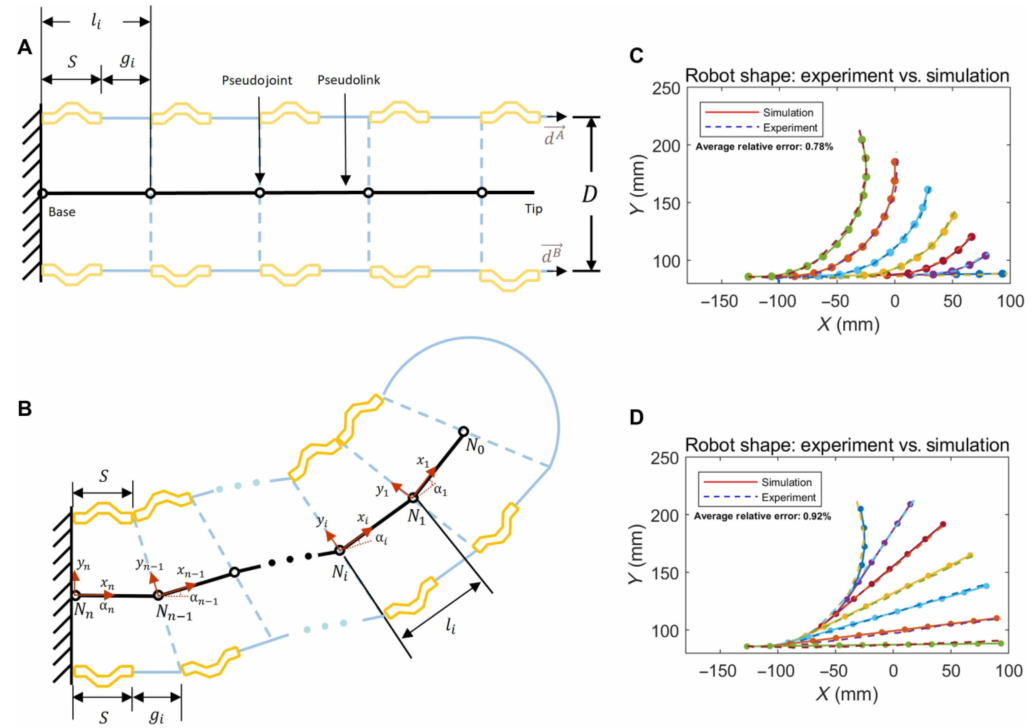 图3C-D显示,仿真预测的11节机器人形状与实验非常吻合,平均相对误差小于1%。这意味着可以用这个模型来预测和控制形状。