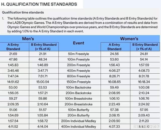 2028年洛杉矶奥运会游泳项目达标标准出炉,和以往基本以上届奥运会前14名成绩定A标不同,这次规则进行调整,明显提高了参赛标准。大满贯巨星潘展乐以全运会的成绩来看,男子50米、100米、200米、400米自由泳全部未达到A标,其中50米和400米B标都没触及。