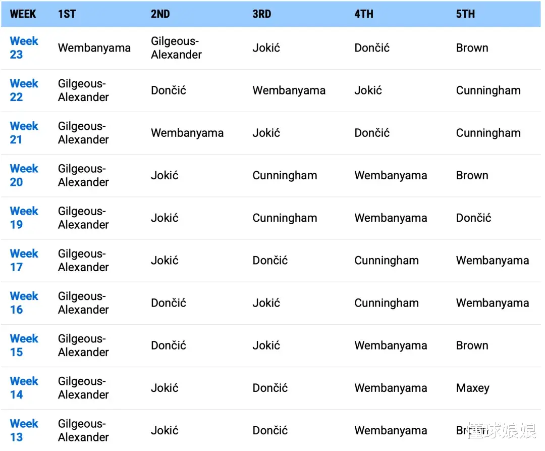 昨天NBA官方公布的MVP榜中,文班亚马反超了亚历山大,升到了MVP榜第一,具体排名如下:1、文班亚马2、亚历山大3、约基奇4、东契奇5、杰伦-布朗