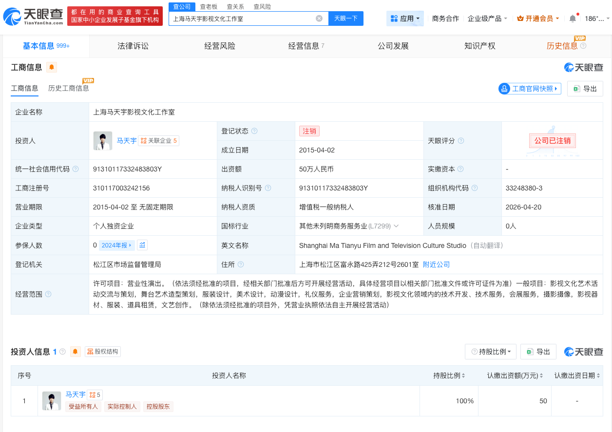天眼查App显示,近日,上海马天宇影视文化工作室经营状态由存续变更为注销。该工作室成立于2015年4月,投资人为马天宇,出资额50万人民币。