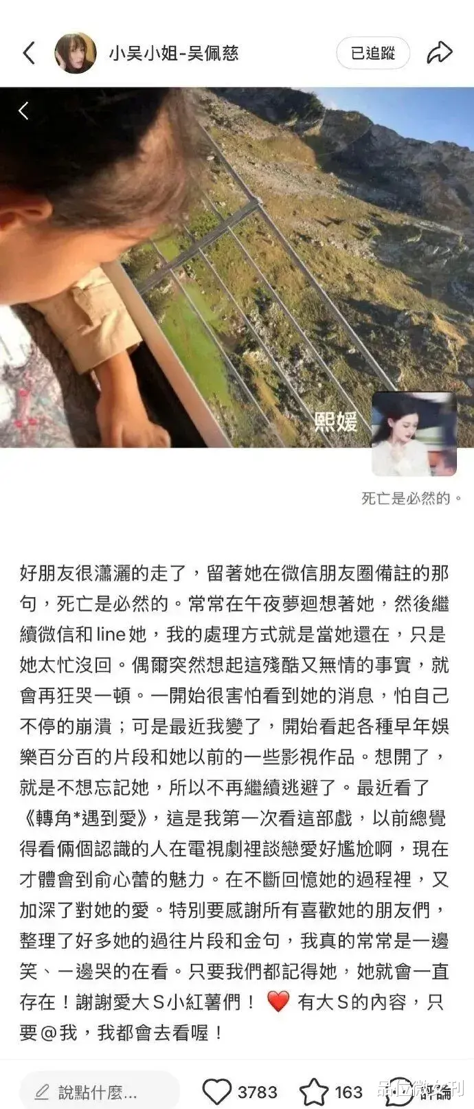 配图是大S生前朋友圈,只露出女儿小玥玥幼时侧脸的背景图,还有那句简洁又深刻的“死亡是必然的”。