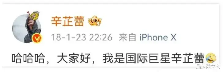 意思是,多年前还是无名之辈的辛芷蕾,“口出狂言”地在微博自我加冕:“大家好,我是国际巨星辛芷蕾”