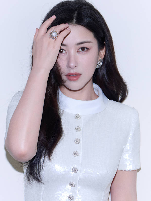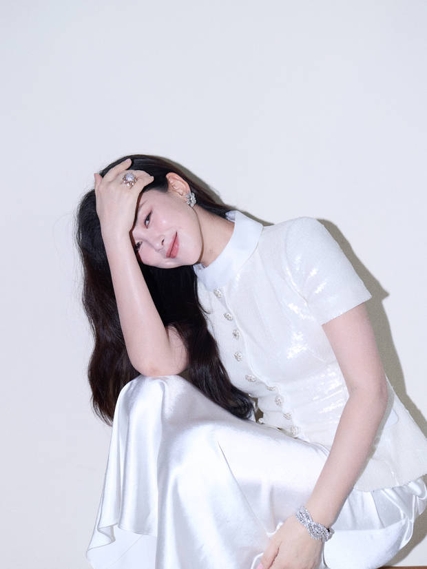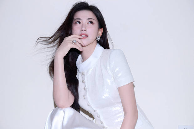 朱珠姿态优雅松弛,白亮片上衣搭缎面裙,手戴钻饰。