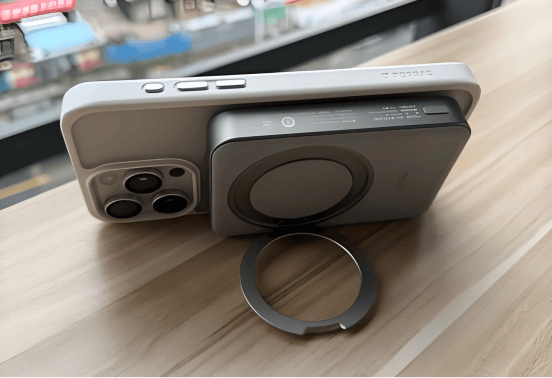 磁吸结构是它比较明显的特点。机身内置 17 颗 N52 磁体,配合防滑硅胶,贴在手机背面时吸附力比较稳,日常走路或者放在桌面使用不容易滑落。另外给 iPhone 充电时会弹出系统动画,体验上会更接近官方配件。不过它没有自带充电线,如果想用有线充电,还需要自己准备一根数据线,这一点在外出时多少有点不方便。