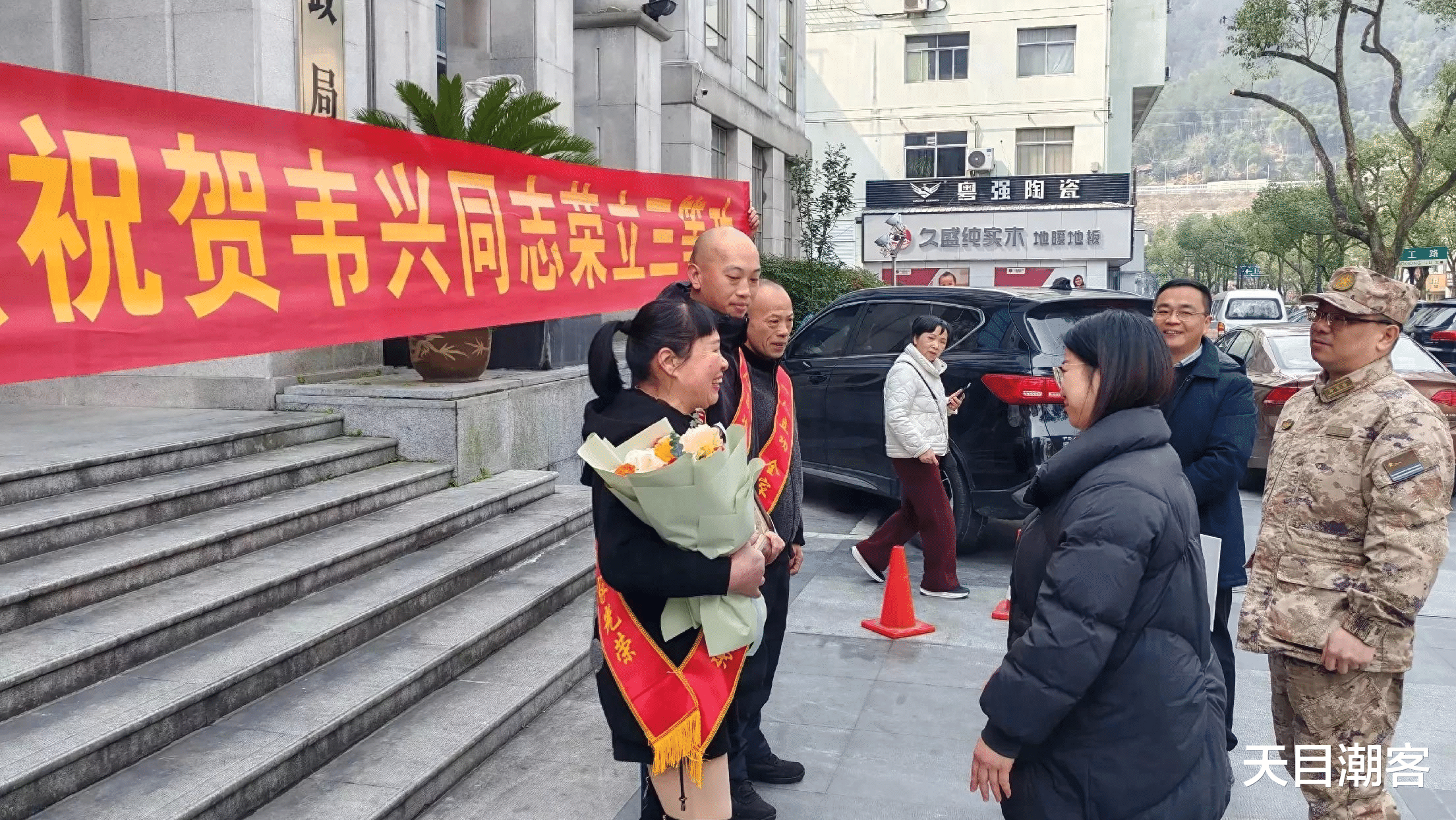 景宁沙湾镇道化村,现役军人韦兴同志荣立三等功的喜讯令人振奋。3月7日上午,其父母在县财政局大门口合影留念,那充满骄傲与喜悦的神情,定格了这荣耀时刻。