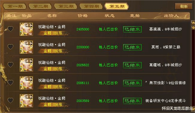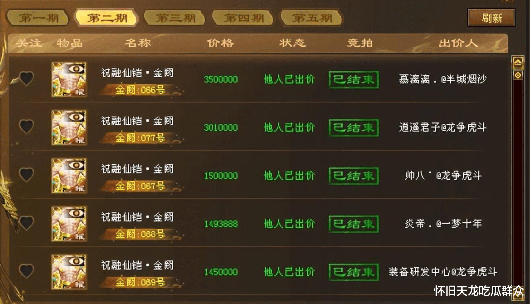 1号黄金甲拍卖价240w,由【半城烟沙】的“慕漓漓”拍下。最高价350w元宝的66号黄金甲也同样是他拿下的。