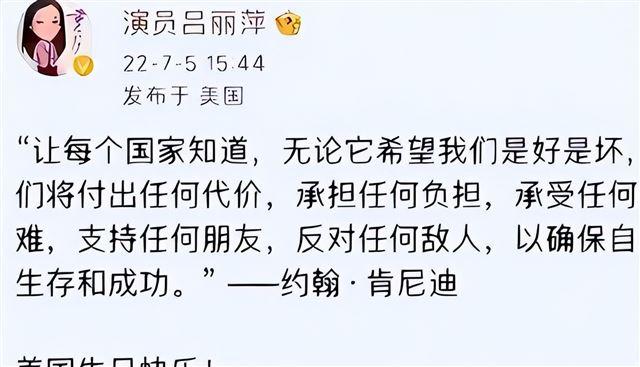 2022年7月5日,吕丽萍在国内社交平台上祝福美国生日快乐,引用肯尼迪的名言,显示自己的优越感。