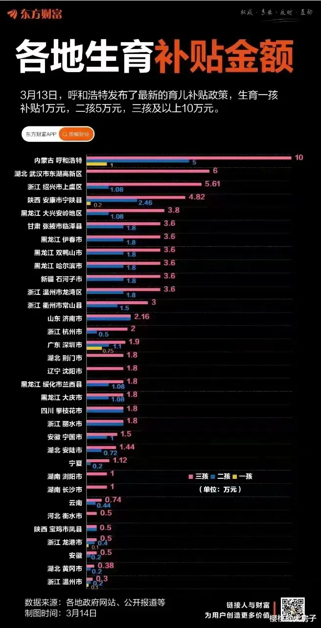 一孩补1万,二孩补5万,三孩补10万,这是近期呼和浩特发布的生娃补贴方案。