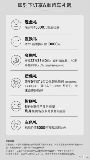 限时优惠窗口期(2025.12.11-12.31)福利拉满:可享1.5万元现金直降、1万元本/外品置换补贴;金融政策更是友好,支持至高12万元36期0息,或首付10%起、60期年化利率3.8%(折合年利率约1.99%)的低息方案,大幅降低购车门槛。