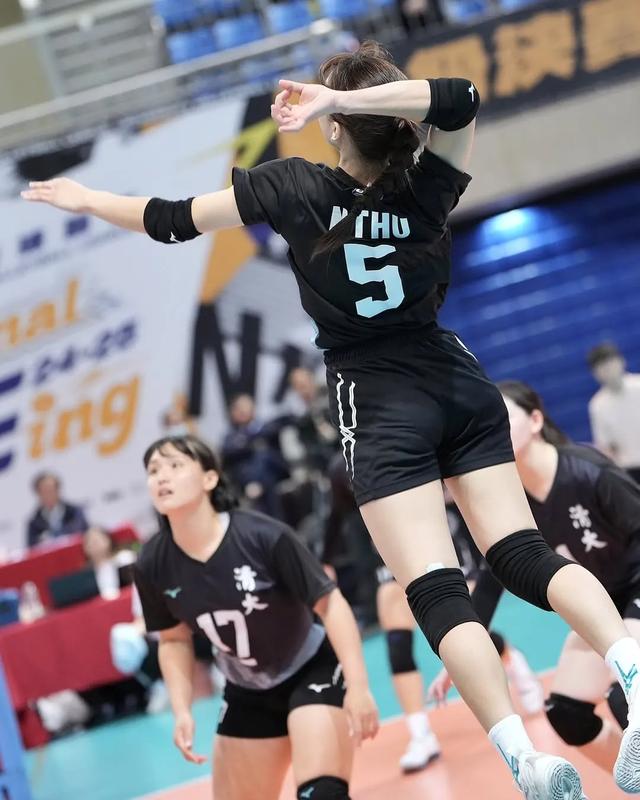 高中排球元气少女,扎着双麻花辫的小姐姐在赛场灵活跑动,黑色V领运动套装勾勒出健美线条,渐变印花与号码标牌随着跳跃动作起伏,仿佛自带女团打歌舞台的青春特效。