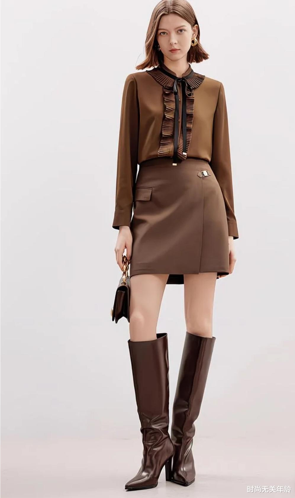比如用一件质地精良的奶白色衬衫,搭配这条丝绒质感的浓郁巧克力色半裙,两种截然不同的色彩在视觉上碰撞出令人惊艳的时尚效果。奶白色的衬衫为整体造型注入清新优雅的气质;而巧克力色的半裙则像冬日里一杯热可可,散发着温暖馥郁的成熟魅力。这两种色彩的相遇,既凸显了女性的柔美气质,又保留了知性得体的职场风范。