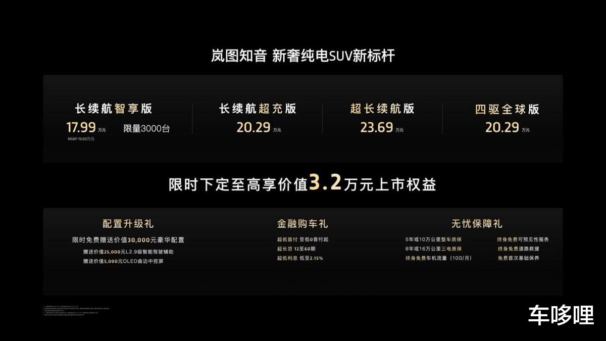 先看看价格,岚图知音共推出了4款配置,售价区间19.69万-23.69万元。最令我们惊喜的是,指导价19.69万元的长续航智享版,更是带来了限量3000台17.99万元的限量优惠价。