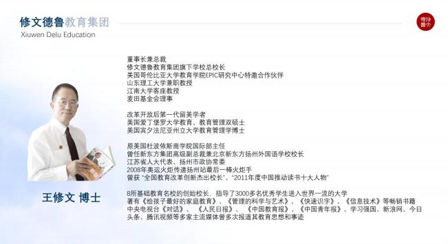自 2000 年回国以来,王博士在中国不同城市创建了多所基础教育学校与教育机构,并著有《给孩子最好的家庭教育》、《快速识字》、《信息技术》、《管理的艺术与科学》等畅销书籍。
