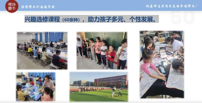 学校除了高效完成国家规定的课程以外,还精心开发设计了特色校本课程。语文教学重视情景教学,经典诵读,阅读指导,演讲训练;数学教学中加强竞赛辅导,思维训练,智力培养;英语教学中外教结合,每周 7 节英语课的比重(一二年级五节外教英语课+两节中教英语课,三四五年级4 节外教英语课+三节中教英语课),更加重视口语、听力的训练,培养阅读能力,注重提高英语综合素养。学校还结合学生实际需要开设有体育类、音乐类、美术类、信息技术类、学科辅导类和综合类等 60 余种校本课程,确保每一个孩子至少有两种特长选修课。学校还利用各种机会进行文明礼仪、心理培育、法制安全教育课等,对孩子进行全面的素质提升。此外,小学部另增设代表中国古典艺术的古筝课和代表西方艺术的钢琴课,加开快速识字课,实现两年时间内掌握小学五年的识字量,全面开展阅读活动,实现小学阅读量 1000 万字的目标。