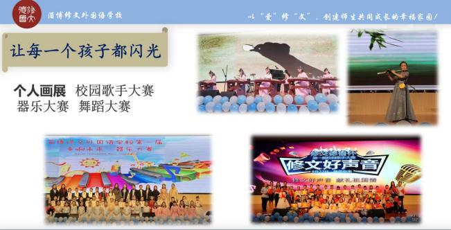 学校的课余生活非常多彩:学校每年开展丰富多彩传统节日主题的活动以外,还举办英语歌曲大赛、舞蹈大赛、修文好声音、校长杯班级足球和篮球联赛、校园吉尼斯等体育竞赛、科技节、数学节、演讲比赛、阅读节、社会综合实践等活动;多彩的课余活动,让孩子们的学习生活充满快乐。每一项活动的开展,均是以孩子的全面发展为目标,面向全员,刻意给孩子创造锻炼展示平台,让孩子们在积极参与和展示中稳步提升自信心和综合能力!