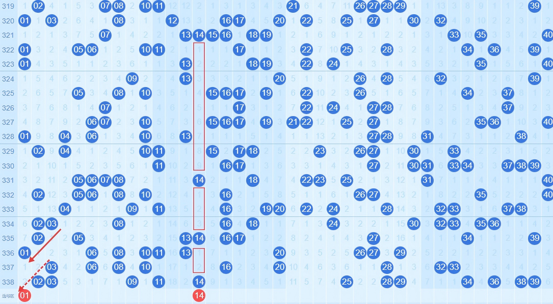01号近期趋冷,应当会弱后回补。且根据历史重现规律,又一次形成斜三连号。