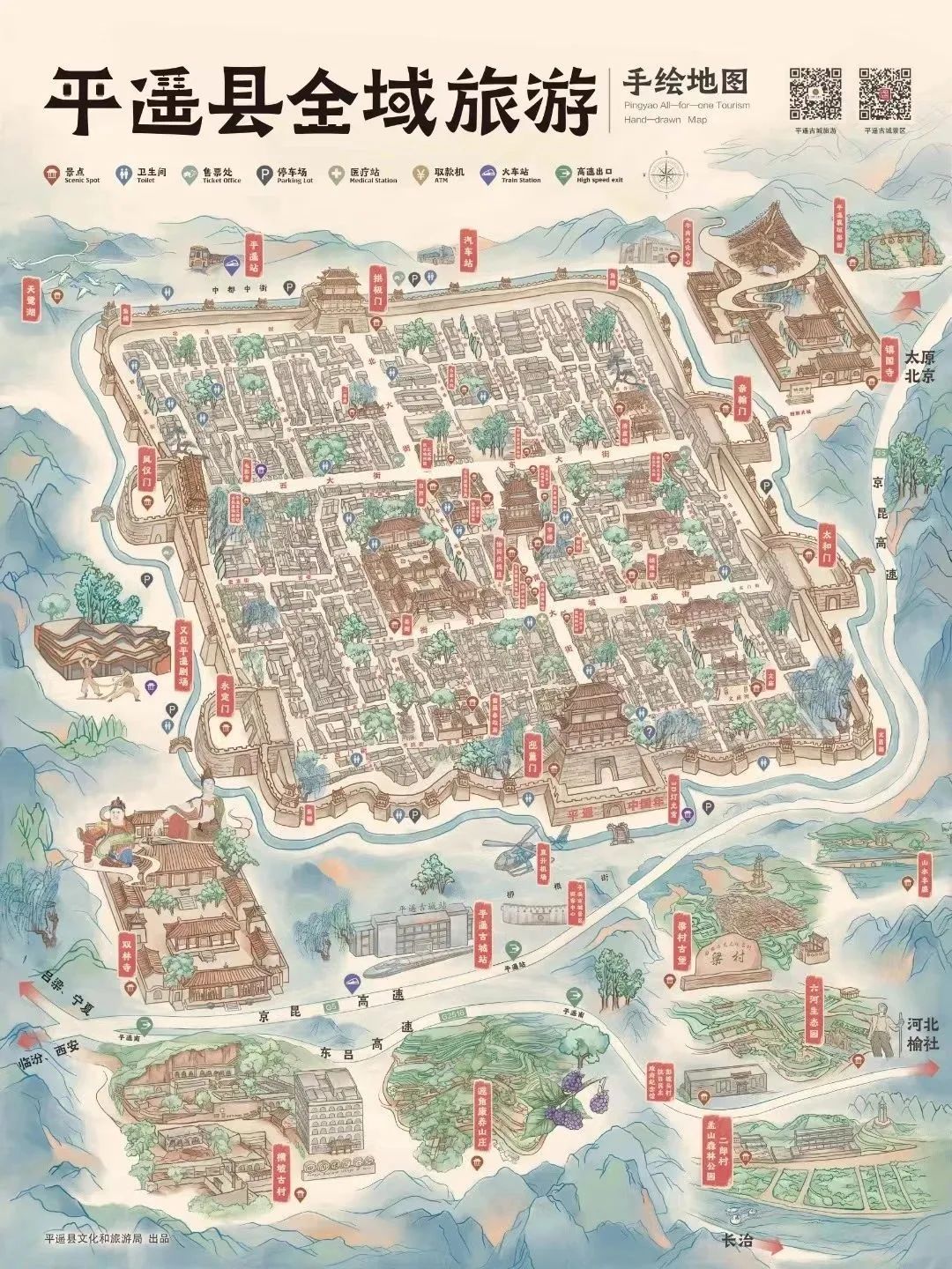 平遥历史悠久,文物古迹众多。中国第一家票号“日升昌”旧址便位于平遥古城内,而平遥古城又与云南丽江古城、四川阆中古城、安徽歙县古城并称为中国“四大古城”。双林寺被誉为“东方彩塑艺术宝库”,镇国寺万佛大殿是中国现存最早的木构建筑之一。默默诉说着当年晋商汇通天下的辉煌。