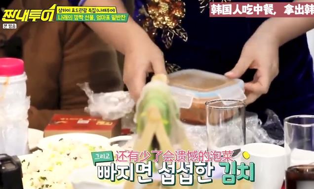 她表示自己还特地问了这家店,说是从外面带料理来吃也没关系,所以她才带了自己做的辣白菜来吃。