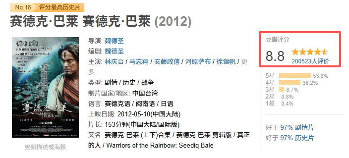 它向观众揭示了一段尘封的历史,无论何时再看,都会被当时台湾原住民们的血性抗争所震撼。