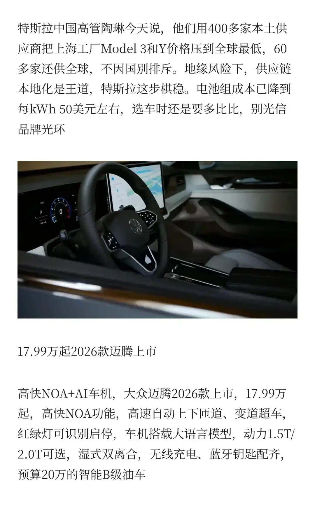 特斯拉中国高管陶琳今天说,他们用400多家本土供应商把上海工厂Model 3和Y价格压到全球最低,60多家还供全球,不因国别排斥。地缘风险下,供应链本地化是王道,特斯拉这步棋稳。电池组成本已降到每kWh 50美元左右,选车时还是要多比比,别光信品牌光环