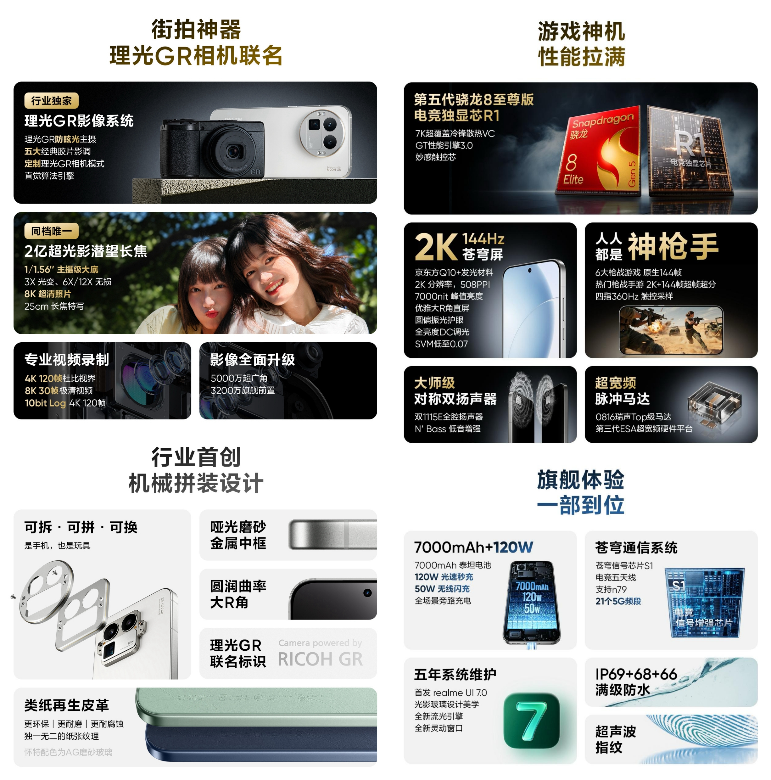 真我GT8 Pro随着真我回归OPPO,真我中高端机型成为目前最具性价比的选择,其中真我GT8 Pro是目前真我配置最高的旗舰手机。真我GT8Pro搭载骁龙8Elite Gen5旗舰芯片,内置电竞独显芯片R1和GT性能引擎3.0,采用2K+144Hz苍穹护眼直屏,续航组合是7000毫安时+120W+50W双重闪充。后置5000万全焦段三摄组合,亮点是2亿超光影潜望长焦和理光GR影像系统,并且带来了可拆卸相机模组设计。