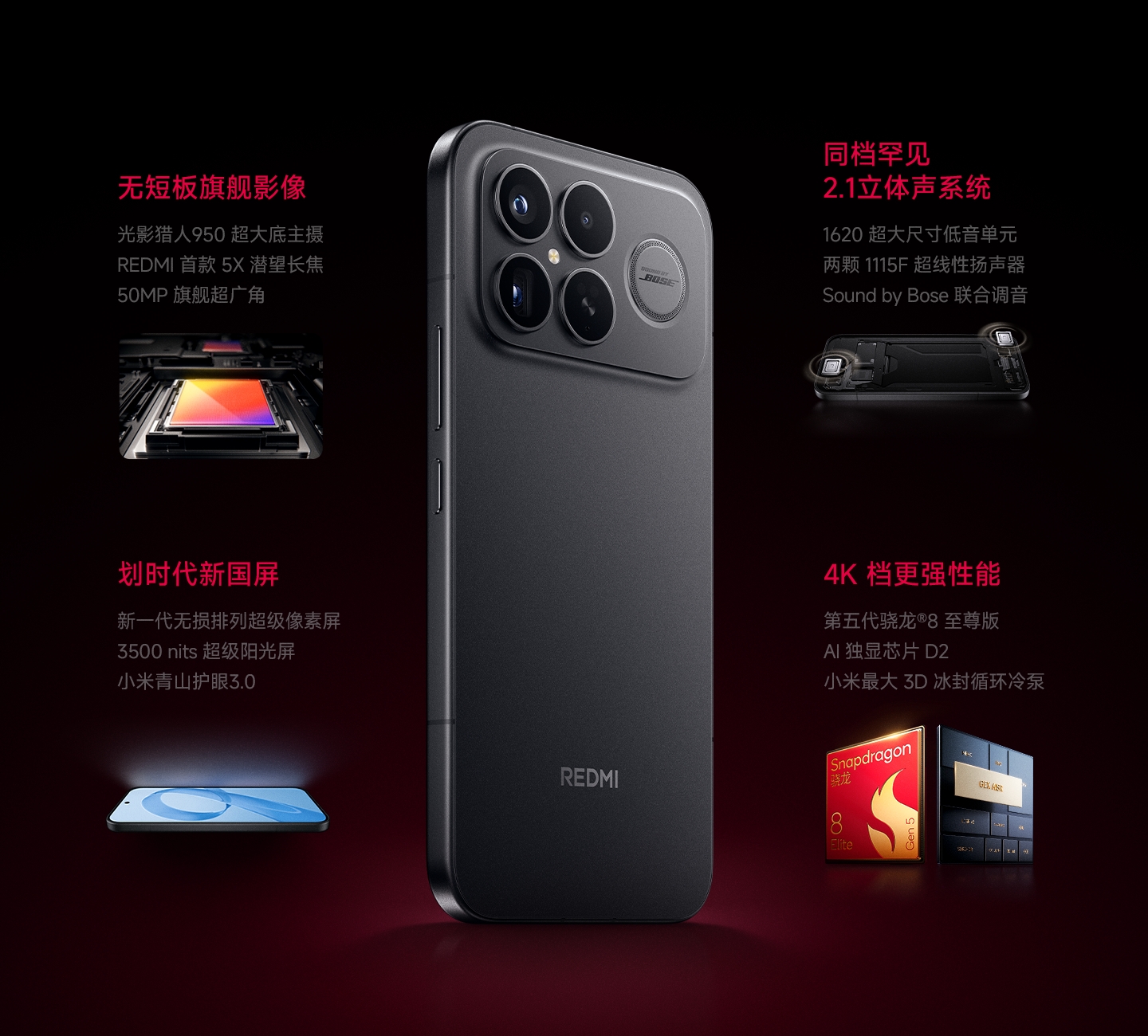 红米K90 Pro Max该机同样搭载骁龙8Elite Gen5满血三件套,电竞方面有AI独显芯片D2和全新狂暴引擎,采用6.9英寸超级像素护眼大屏(1.5K+120Hz),续航组合升级为7560毫安时+100W+50W双重闪充。机身内置2.1立体声豪华三扬,并且由小米和Bose联合调音,是目前智能手机的音频天花板,拿来追剧和游戏都是极好的选择。整机的耐用性大幅提升,不仅有小米龙晶玻璃和四曲包裹式金属中框,还通过了IP68防尘防水认证。