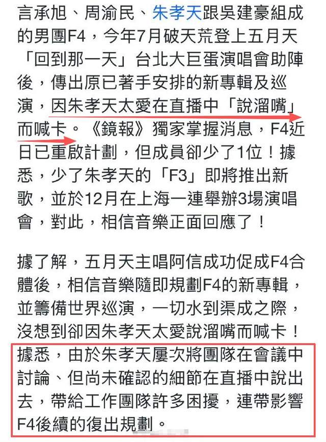 而根据知情人士透露,朱孝天被除名的真正原因,是他多次在直播中泄露F4合体演唱会及新歌筹备细节,被团队视作“不可控因素”。