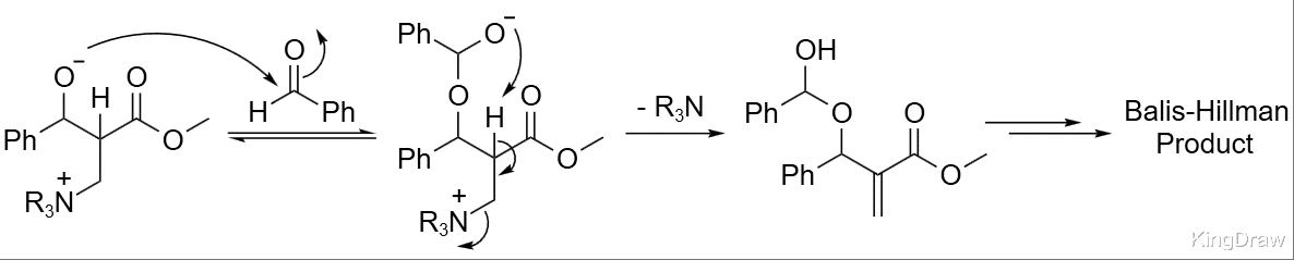 对于芳香醛在极性,非极性和质子性溶剂条件下,都确定了反应的速度决定步骤,首先是 DABCO 和丙烯酸酯的加成,而后是和醛的反应。基于反应速率数据,Tyler McQuade 最近提出 (J.Org. Chem.2005, 70, 3980.DOI),以下有半缩醛参与反应的机理。