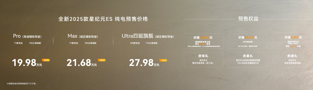 星途不但积极布局未来,对于现有产品也不断迭代升级。继星纪元ES增程版3月上市即热销之后,星纪元ES产品家族再次迎来重磅升级。发布会上,星途正式开启了全新2025款星纪元ES纯电车型的预售,预售价格19.98万元-27.98万元。