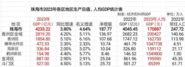去年,全市按2022年末常住人口247.72万人计算,人均GDP超过17万元,其中,有两个功能区人口少、GDP值又很高,导致人均GDP超过百万元。所以为了避免这种极端情况,还是以行政区统计为准,香洲区人均GDP最高,超过20万元,其次是金湾区,人均GDP19.56万元。