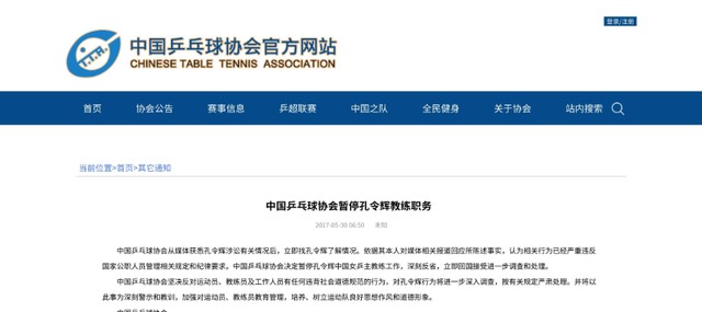 事件发酵后,国家乒乓球协会当即暂停了孔令辉的中国女乒主教练的工作,并发表严正声明:孔令辉本人行为已经严重违反纪律,亟需处理。