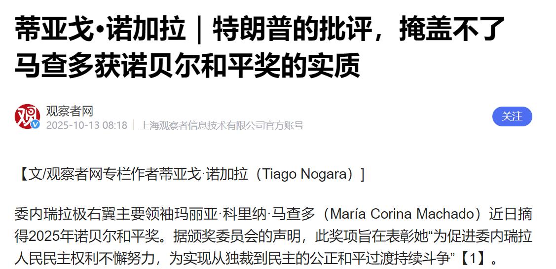 马查多这次荣耀回归,根本不是落难英雄的胜利,而是一场华丽包装下的政治投诚。