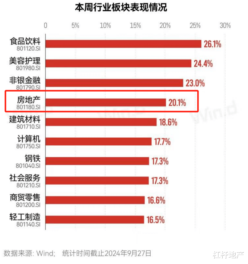 值得注意的是,房地产企业在这一波行情中表现尤为出色。根据杠杆地产粗略统计,A股昨天(9月26日)涨停的房地产相关公司多达29家,今天(9月27日)依然有24家。
