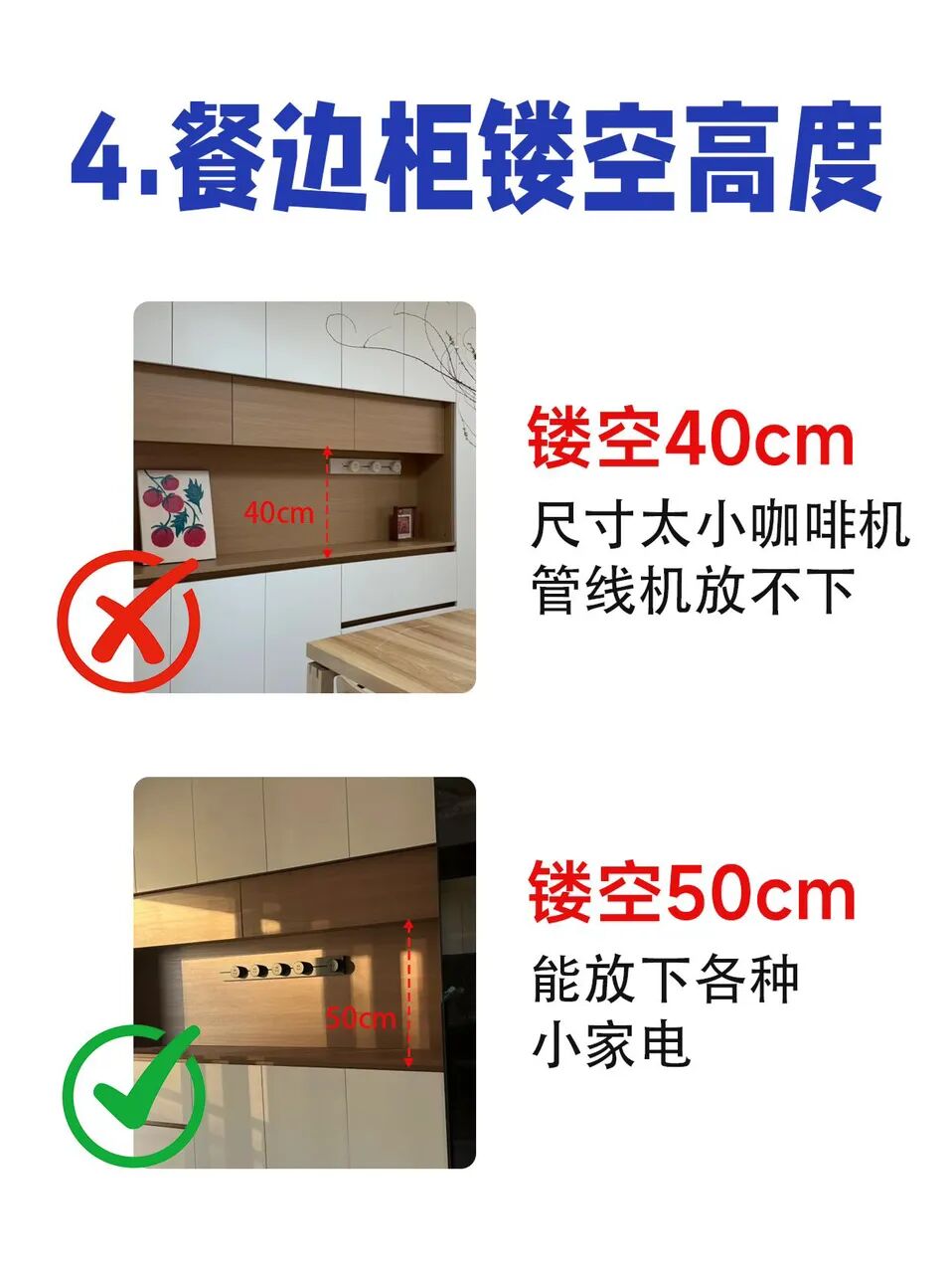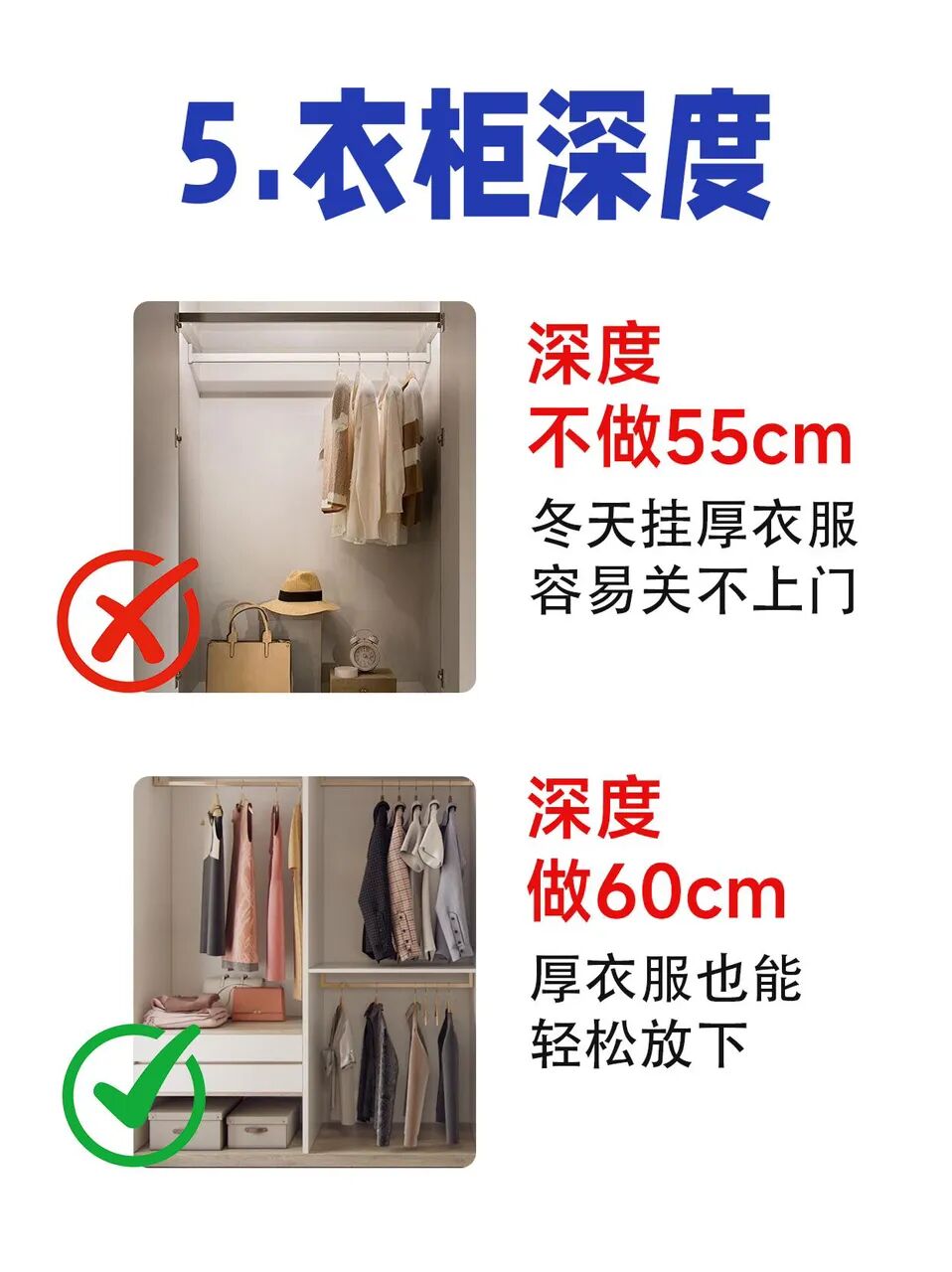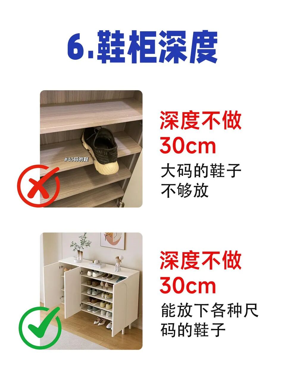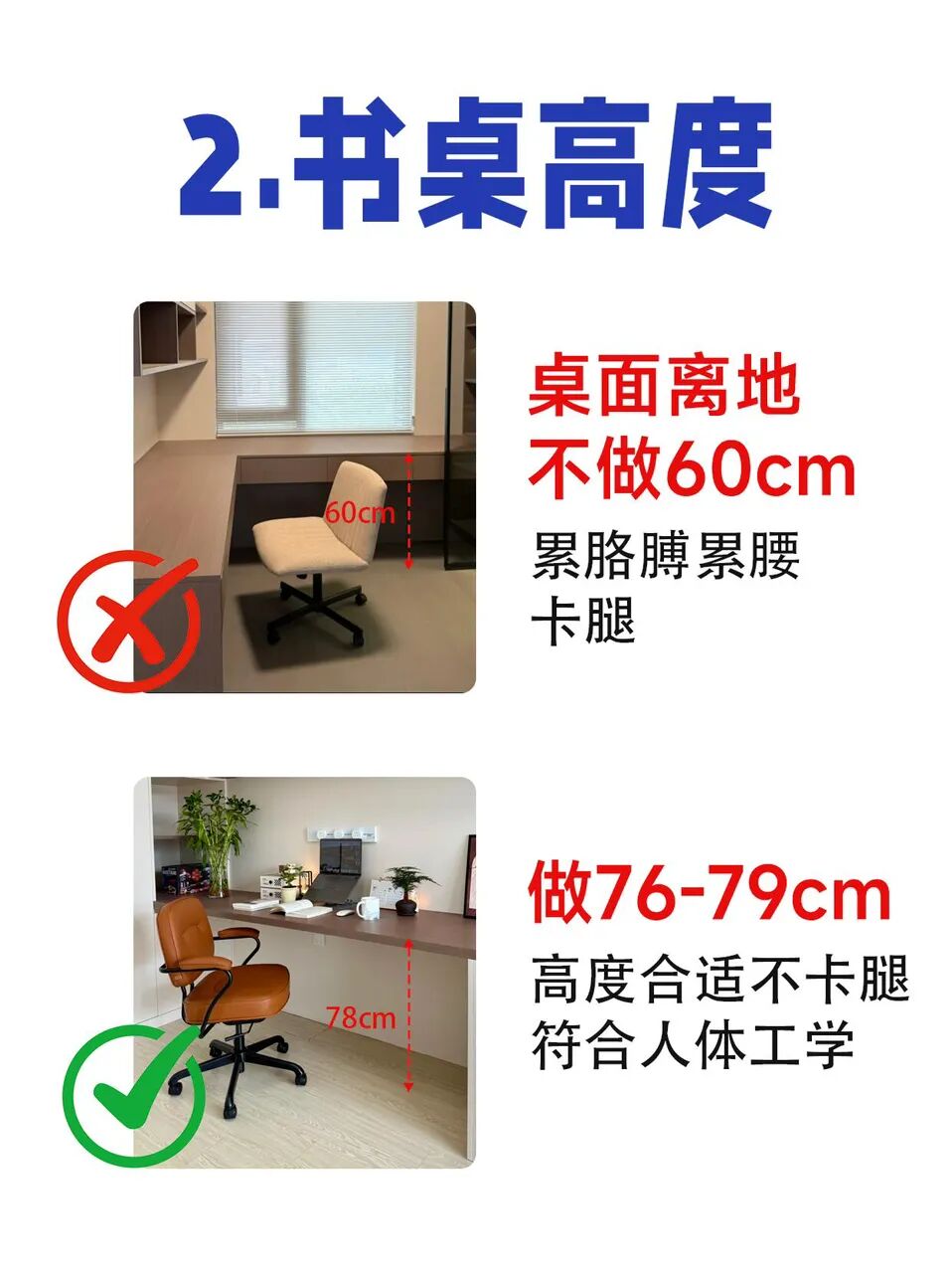 1️⃣ 浴室柜高度❌ 不做 80cm → 洗脸洗锅易弯腰,伤腰费劲✅ 做 90cm → 适用多种身高,舒适不累腰 2️⃣ 书桌高度❌ 不做 60cm → 胳膊累、腰酸、腿易卡住✅ 做 76-79cm → 符合人体工学,办公学习更放松 3️⃣ 橱柜高度❌ 不做 80cm → 洗碗备菜一直弯腰,尤其伤腰✅ 做 85cm(统一高度)或 高低台(洗菜区 90cm)→ 下厨轻松更护腰 4️⃣ 餐边柜镂空高度❌ 镂空 40cm → 咖啡机/管线机放不下,实用性低✅ 镂空 50cm → 常用小家电都能容纳,整洁好用 5️⃣ 衣柜深度❌ 不做 55cm → 冬季厚外套关不上门,易夹衣服✅ 做 60cm → 大衣羽绒服轻松挂,关门无压力 6️⃣ 鞋柜深度❌ 不做 30cm → 男鞋或大码鞋放不下,只能斜放✅ 做 35cm+ → 各种尺码鞋子都能整齐摆放 7️⃣ 鞋柜底部留空❌ 留空 15cm → 短靴、高帮鞋塞不进,很尴尬✅ 留空 20cm → 常穿鞋靴轻松推进,方便整洁