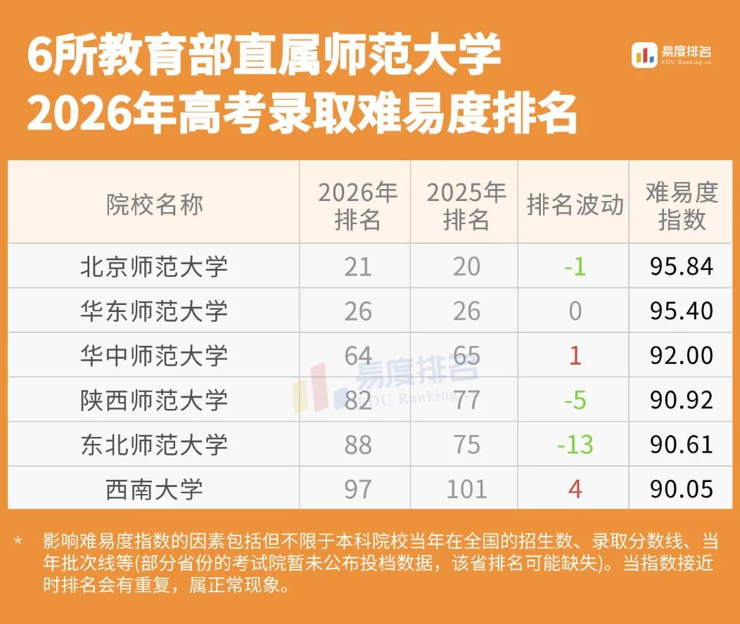 东北师范大学东北师范大学较2025年下降13名,是跌幅最明显的部属师范院校。可能由于部分专业仅分配至特定区域,学生报考意愿降低;同时,东北地区经济相对滞后,就业机会较少,本地生源减少,外地考生报考意愿降低 。