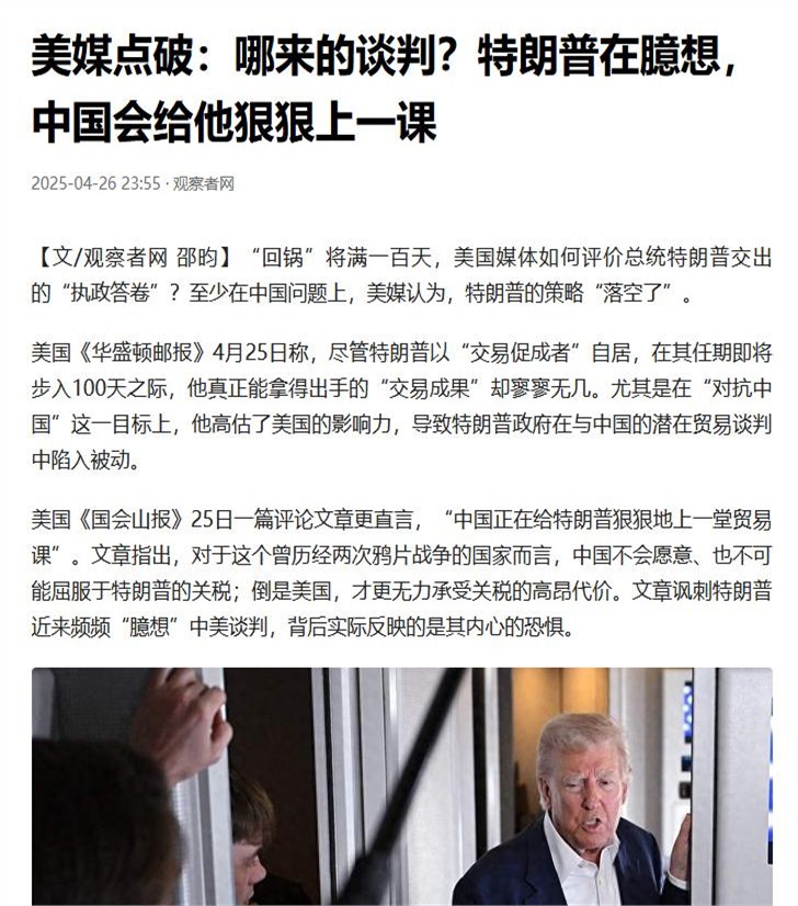 美国《国会山报》25日一篇评论文章更直言,“中国正在给特朗普狠狠地上一堂贸易课”。文章指出,对于这个曾历经两次鸦片战争的国家而言,中国不会愿意、也不可能屈服于特朗普的关税;倒是美国,才更无力承受关税的高昂代价。文章讽刺特朗普近来频频“臆想”中美谈判,背后实际反映的是其内心的恐惧。