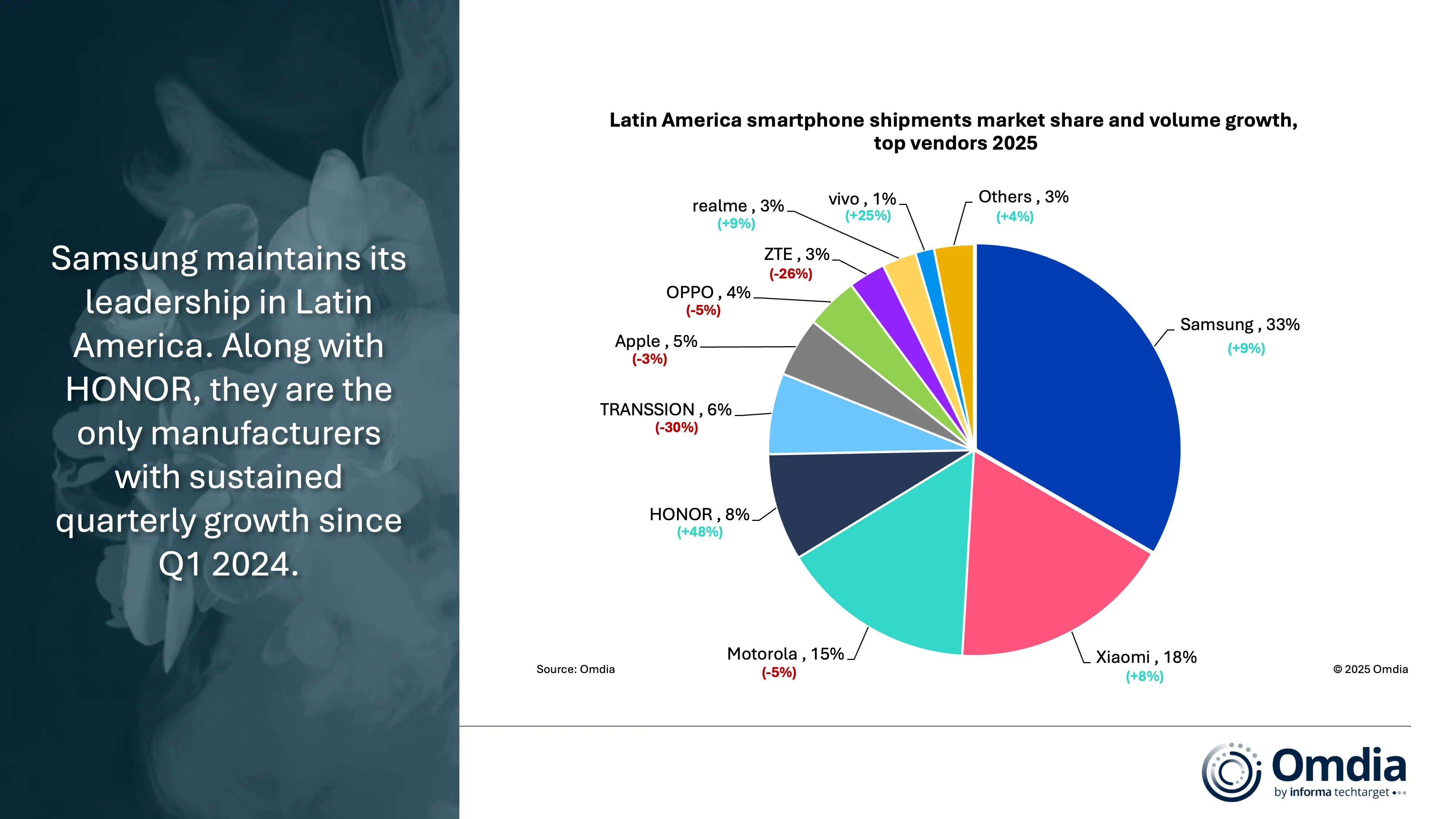 排名第三的拉丁美洲,该地区全年出货量为1.405亿部,占全球智能手机出货量的11.28%,约等于中国大陆市场出货量的50%。和印度市场不同,三星手机是该地区的霸主,以33%的市场份额排名第一。小米紧随其后,拿到了18%的市场份额,排名第三的是国内不太常见的摩托罗拉,该品牌在欧美地区的成绩还是挺不错的。荣耀成为该地区最大的黑马,拥有第四名的成绩和48%同比增长,排名第五的市场国内厂商传音。