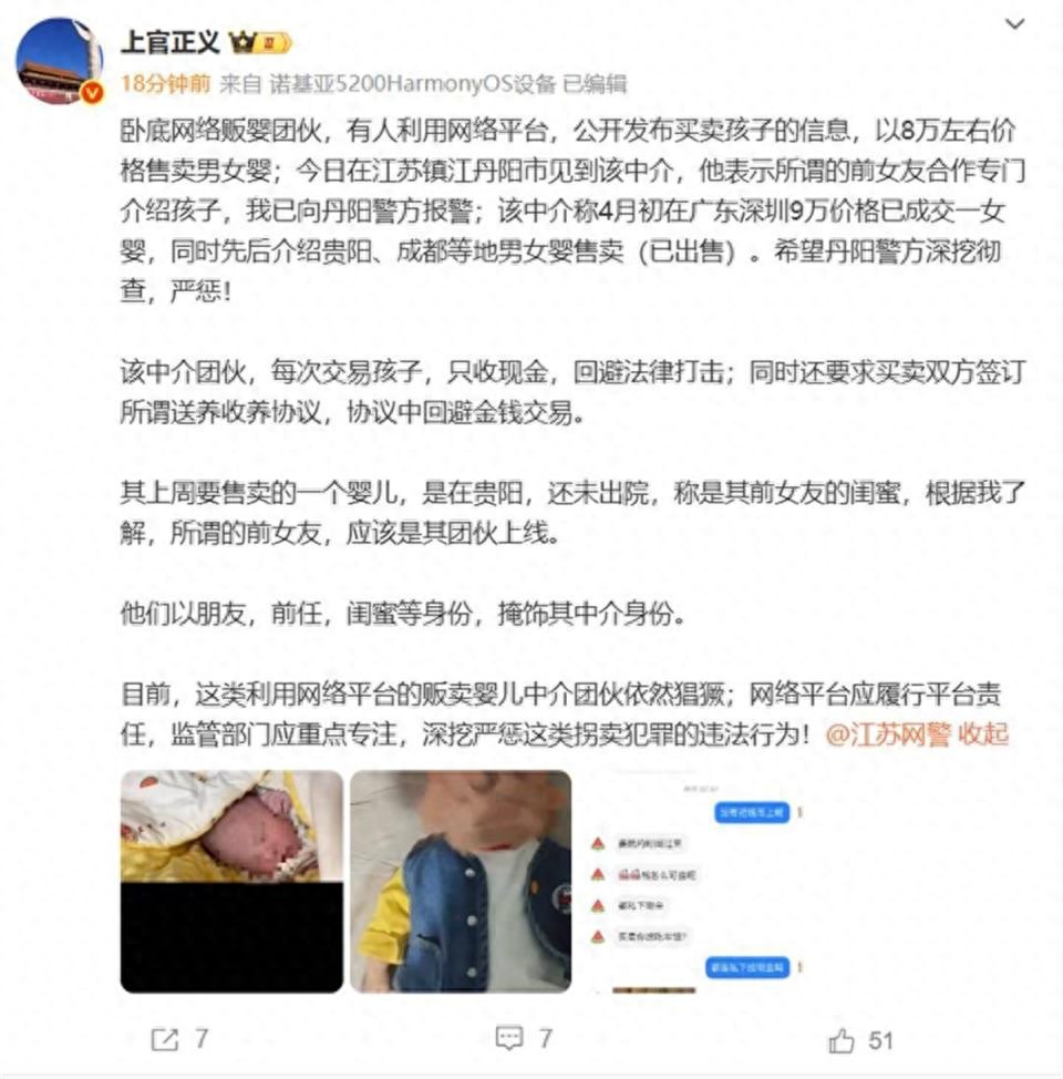 这位95后年轻人已经追踪网络贩婴链条整整72小时。他伪装成"客户"混进隐秘聊天群,亲眼见证中介像卖商品般展示婴儿信息:"贵阳男宝健康,成都女婴三个月大,深圳刚成交一个女娃9万"。每段文字都配有暗语:"领养""送养",实则明码标价8万元起步。