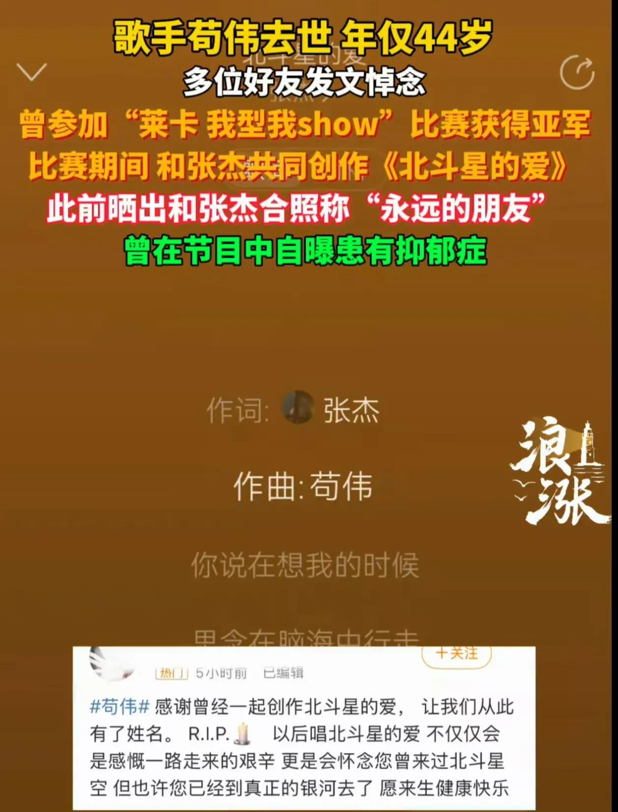 5 月 7 日中午,张杰的微博发了一条很长的悼文,悼念一位刚刚离世的好友。他就是音乐人苟伟,年仅 44 岁,如此年轻有才的他,突然间得离世,让网友们纷纷感到惋惜。