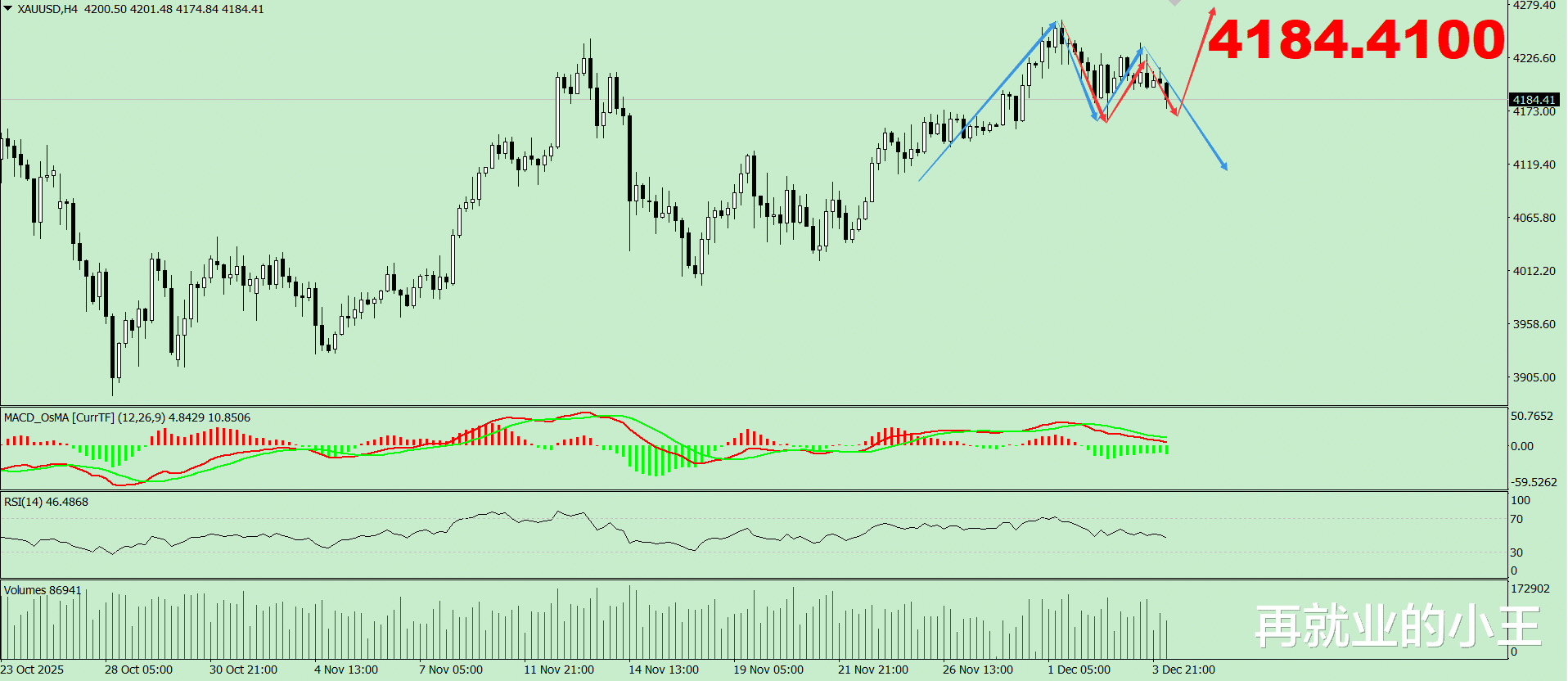 盘面上,昨天直播里已经讲的非常清楚了,4小时上可能会形成顶部形态,但是也有可能形成上涨过程中的底部形态,如果是顶部形态,那么黄金大概率就要进入周线调整了,如果是上涨过程中的底部形态,那么日线新高大概率就没跑了。