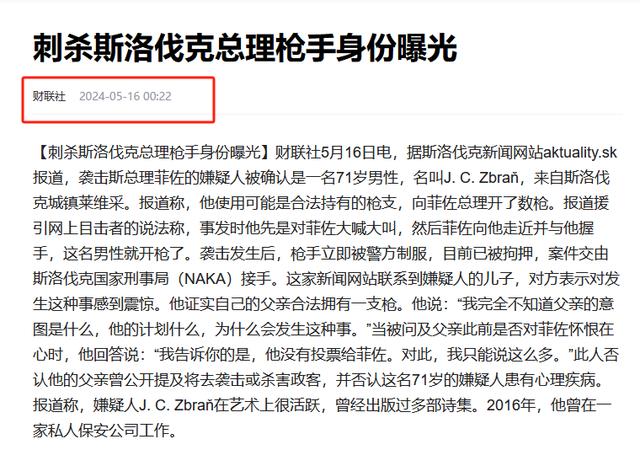 【4】刺杀斯洛伐克总理枪手身份曝光.财联社 [引用日期2024-05-16]