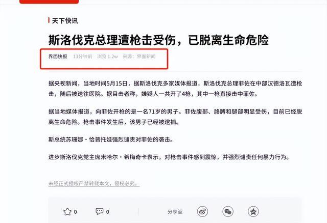 【3】斯洛伐克总理遭枪击受伤,已脱离生命危险|界面新闻 · 快讯.界面新闻 [引用日期2024-05-15]