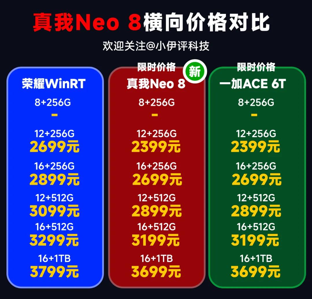 整体来说,真我Neo8整体和一加ACE 6T完全同价,各版本价格都一致;比荣耀WinRT同配置低300元,国补后的价差则缩小到200元左右。