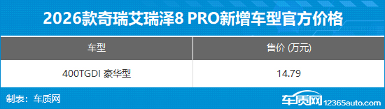 12月10日,奇瑞艾瑞泽8 PRO新增一款400T车型,官方指导价14.79万元,抢先惊喜价13.29万元。与此同时,官方还推出了购车权益,包含400T置换购车至高可享5000元补贴、400T维修保养免费上门取送车、400T 2025年12月31日前购车赠送竞速运动套件等(详情请咨询当地经销商)。