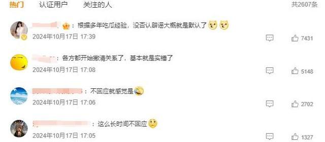 网友们清一色的认为,应该还是私生活丑闻的事情,以大家多年的吃瓜经验显示,只要是没辟谣的大概率都是真的,各方都开始撇清关系。