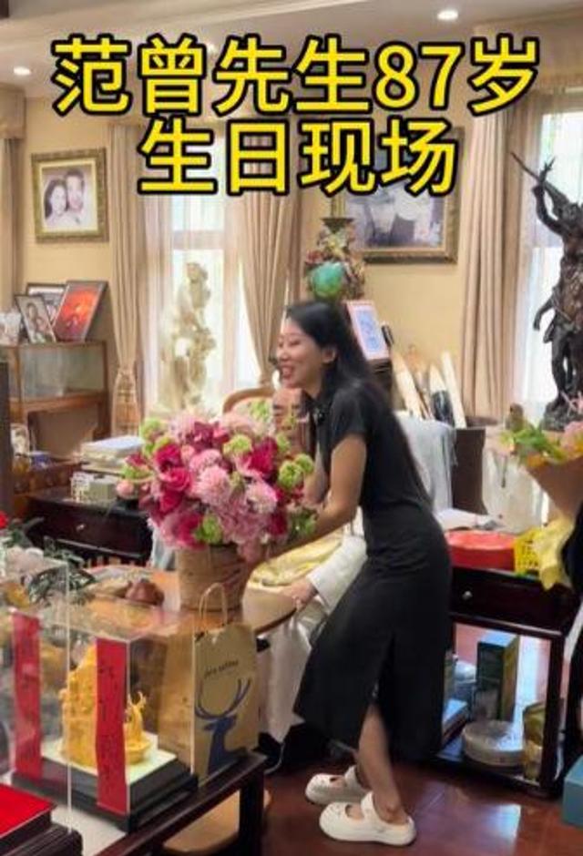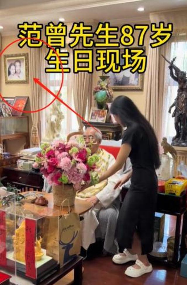 而桌子上已经摆满了亲朋好友送来的礼物,除此之外,仔细观察视频后,发现屋中墙上还挂着范曾与前妻的合影。
