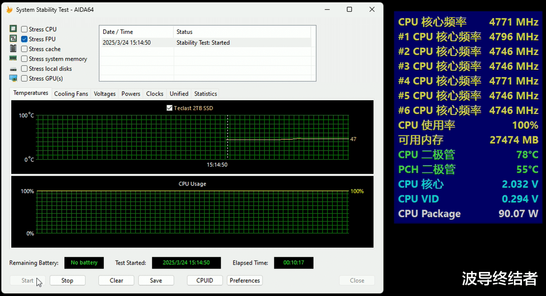 烤机10分钟,好像AIDA64识别AMD参数一直有点问题。这里的电压从没变过,肯定是不准的。主板默认功耗墙90W,双塔风冷在25度左右气温压在75-78度左右徘徊,如果把主板风扇调成70就满速应该可以压更低,不过没必要。很符合7500F散片网上的普遍体质。