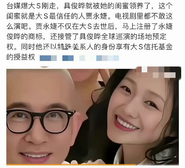 更让人惊讶的是,贾永婕还被曝出以特殊关系人的身份享有大S信托基金的授益权。这操作,简直比电视剧还狗血!难道,贾永婕真的是大S的“最佳闺蜜”,连她的前夫和财产都一并“照顾”了?这背后的“神秘力量”,真是让人好奇不已。