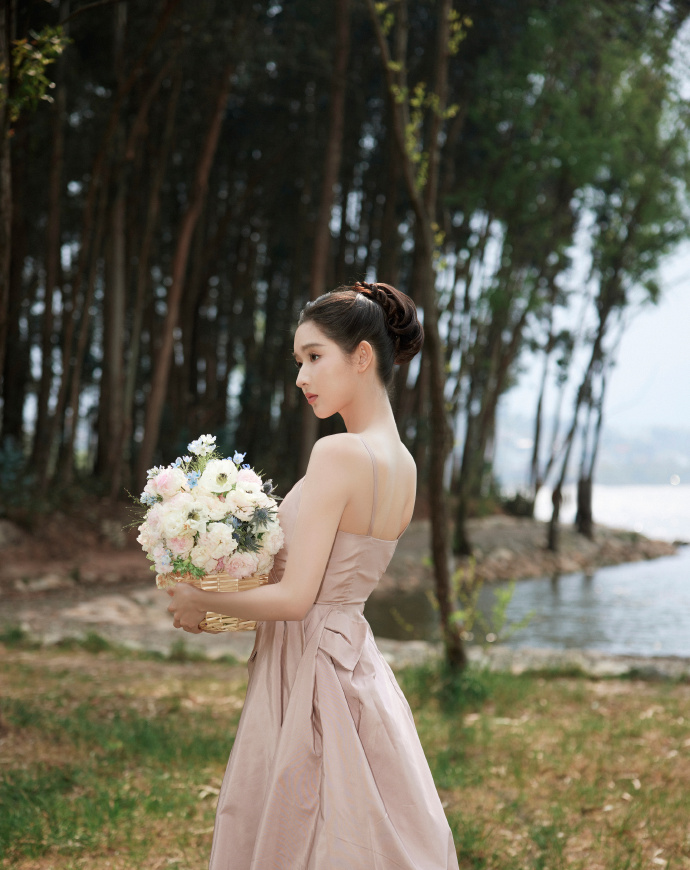 她的穿搭简约而不失时尚,白色的连衣裙与湖水的蓝形成了鲜明的对比,更凸显出她的清新与纯净。