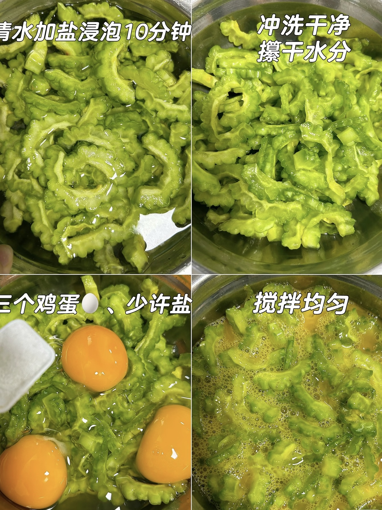苦瓜片扔碗里,加一勺盐、两勺清水,手指轻轻按摩两分钟,逼出绿色小水珠,这是“预苦”仪式,腌完冲水,苦意随水流走,只剩清新青草味。
